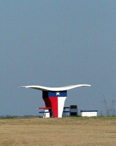 I’m also familiar with middle of the nowhere Texas which is marked by wide expanses of sky and concrete. The only thing that breaks up the monotony are the occasional cattle ranch or rest stop complete with steer horns. See below: