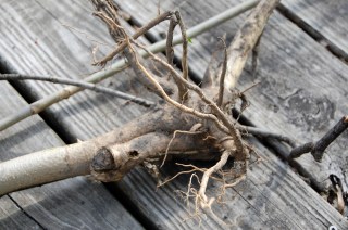 This past Friday I received the first part of my order from Spring Hill Nursery, so Sunday I spent most of the afternoon planting and weeding. Usually, wedding entails dandelions and wild strawberry plants and even some stinging nettles. However, all of these foes, while abundant and annoying, come out of the ground without much of a problem. This was especially true Sunday because we’d had some rain over the weekend, so the soil was moist and easier to dig into. I got a lot done on the weeding front Sunday, so when I looked toward the back of the yard and saw two small saplings growing by the side of our garage, I thought “Well, I can pull those out too.” Famous last words.