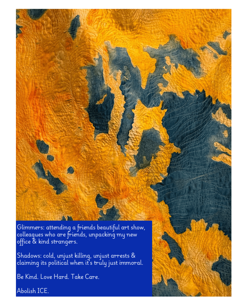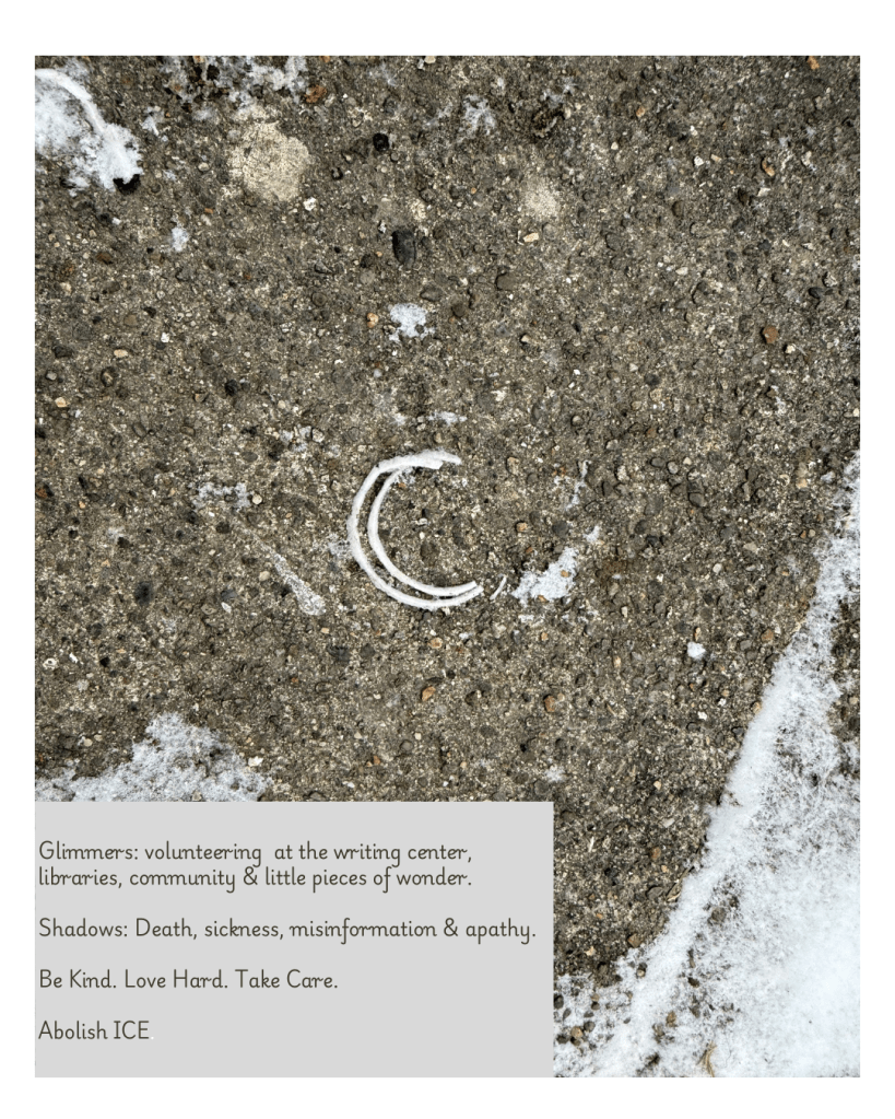 Awhile back one of my students introduced me to the idea of “glimmers” when they wrote a poem about them for my class. I loved the idea and ever since I’ve been looking for glimmers every day. This week was hard. Even before the election. I have cried. A lot. I have also been so lucky in the love I’ve received from my my family and friends and colleagues and fellow creatives. And because I am a creative and find comfort in ritual and am desperately trying to find reasons each day to find joy and peace and beauty, while also acknowledging that things are completely fucked, I am going to give myself a writing prompt.