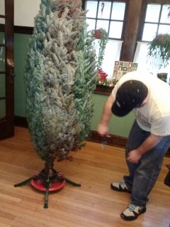 This past Sunday we braved the rain and went out to buy our Christmas tree. We do not cut our own tree because a). my husband hates nature and b). we like to support the local guys who typically set up in parking lots near places like Gold’s Gym. After prowling around the tent for about 10 minutes, we selected our Douglass Fir and after some chainsawing and twining (two real live Christmas tree terms) we had our tree safely back at our house. Here is what followed: