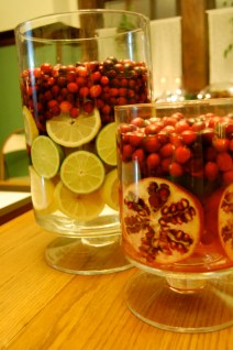 As you can see, I used all sorts of fruit. I was only planning on using cranberries, lemons & limes, but when I went to the grocery store, they had pomegranates on sale four for five dollars. They’re pretty fruits cut or uncut, so I thought I’d give it a shot. While cutting the pomegranates for the centerpieces, it dawned on me that a). I’ve never eaten pomegranate b). I had no clue how to eat a pomegranate. So what did I do? What every American does when faced with a problem. I googled it.