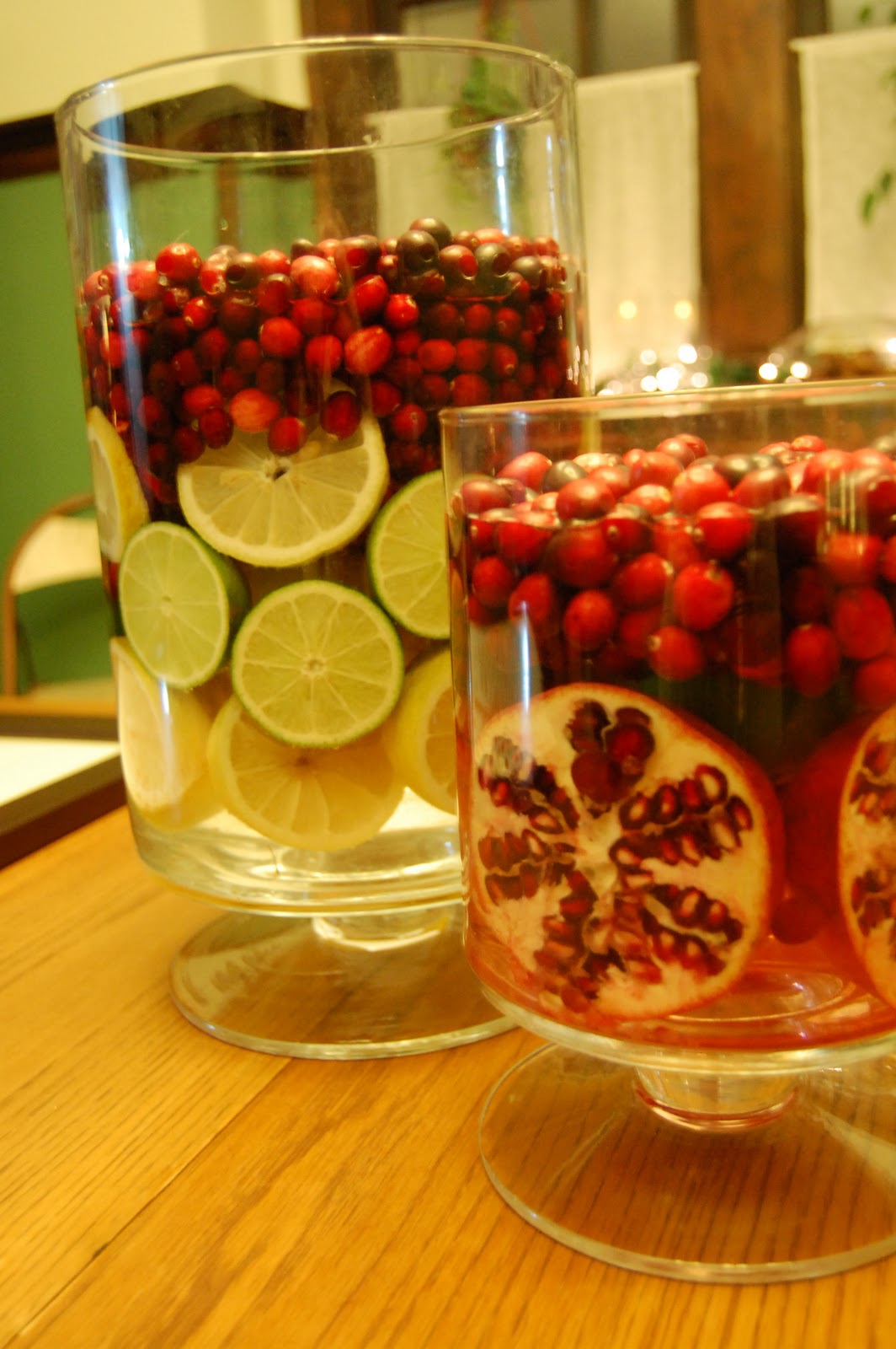 As you can see, I used all sorts of fruit. I was only planning on using cranberries, lemons & limes, but when I went to the grocery store, they had pomegranates on sale four for five dollars. They’re pretty fruits cut or uncut, so I thought I’d give it a shot. While cutting the pomegranates for the centerpieces, it dawned on me that a). I’ve never eaten pomegranate b). I had no clue how to eat a pomegranate. So what did I do? What every American does when faced with a problem. I googled it.