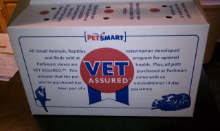 While at PetSmart, the young lady helping us made the remark that our finches were “lucky birds.” If you know anything about our dog or cat, you know that we’re professional pet spoilers, so I don’t know why the finches would be any different. We were careful to buy all the necessary accessories, we read up on Zebra Finches online and we chose a perfect spot for the cage. However, we failed to get one key piece of information. How do you get the birds from this box: