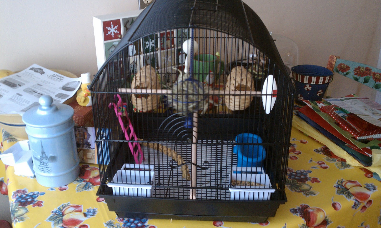 Finches like to build nests, so we needed hay and little nesting houses for them. We also had to buy finch food and a cuttle bone. The cuttle bone is literally a bone that the birds can peck on throughout the day. It provides them with calcium. They like to have several different perches at different levels in the cage and they like to bathe, so we bought them a little bathtub. After their cage was properly outfitted it looked like this:
