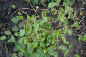 This past Friday I received the first part of my order from Spring Hill Nursery, so Sunday I spent most of the afternoon planting and weeding. Usually, wedding entails dandelions and wild strawberry plants and even some stinging nettles. However, all of these foes, while abundant and annoying, come out of the ground without much of a problem. This was especially true Sunday because we’d had some rain over the weekend, so the soil was moist and easier to dig into. I got a lot done on the weeding front Sunday, so when I looked toward the back of the yard and saw two small saplings growing by the side of our garage, I thought “Well, I can pull those out too.” Famous last words.