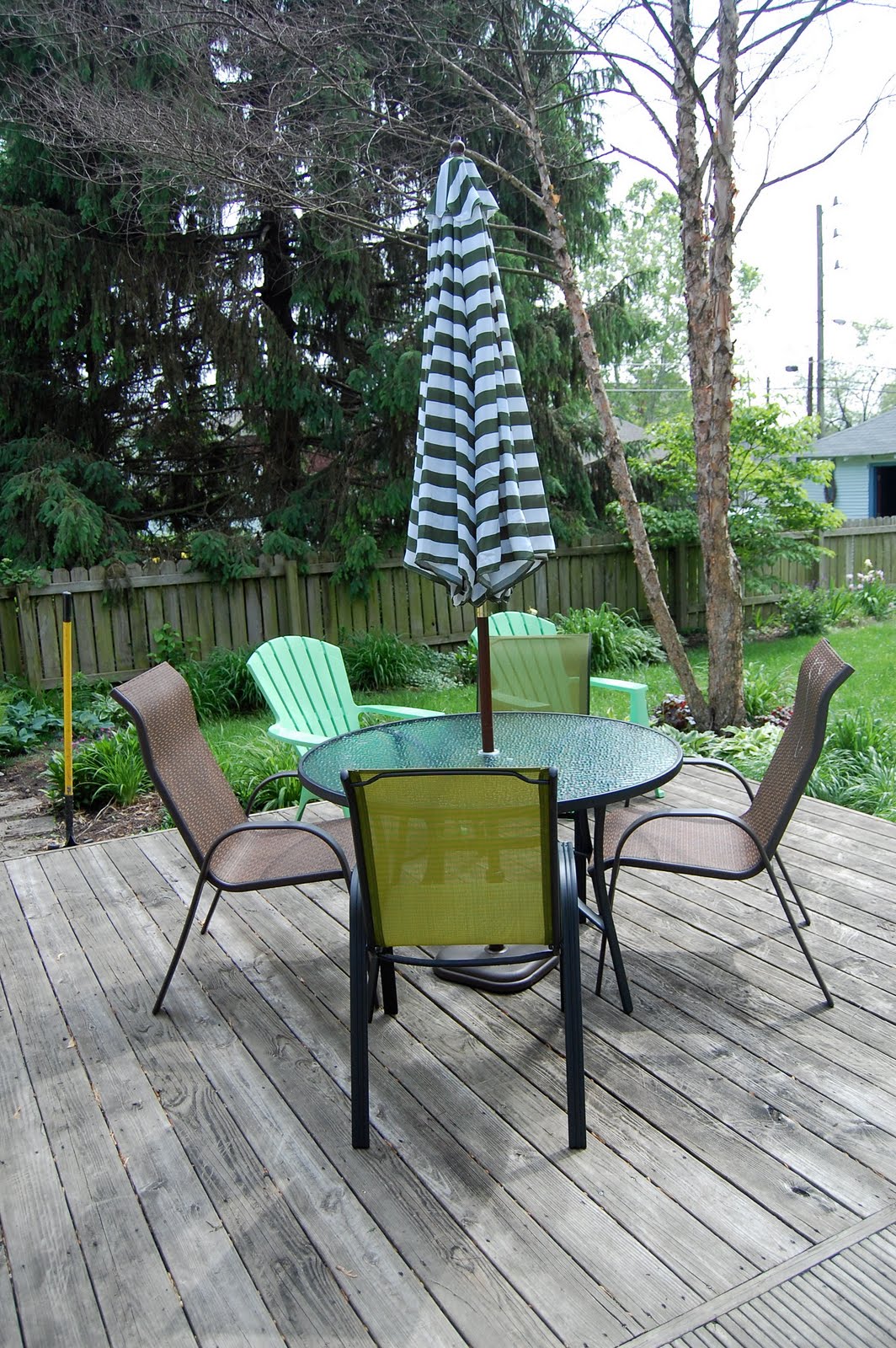 2) Bringing up our patio furniture and assembling it. While this may not sound like a particularly arduous task, there are few things you have to take into consideration. It was 86 degrees yesterday by 11:oo am. The table, umbrella and chairs were down in the