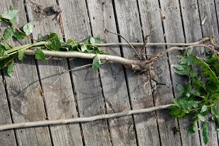 This past Friday I received the first part of my order from Spring Hill Nursery, so Sunday I spent most of the afternoon planting and weeding. Usually, wedding entails dandelions and wild strawberry plants and even some stinging nettles. However, all of these foes, while abundant and annoying, come out of the ground without much of a problem. This was especially true Sunday because we’d had some rain over the weekend, so the soil was moist and easier to dig into. I got a lot done on the weeding front Sunday, so when I looked toward the back of the yard and saw two small saplings growing by the side of our garage, I thought “Well, I can pull those out too.” Famous last words.
