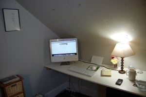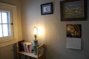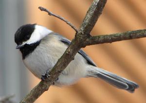 A few weeks ago I hung a bird feeder up that my mother gave me for Christmas. It’s in the shape of a little white house with Plexiglas sides, so when you pour the black sunflower seeds inside, it looks like a little black and white cottage is hanging off our garage.
