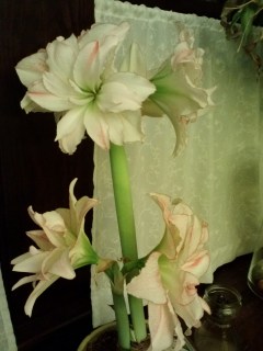 This is my Aphrodite Amaryllis that my mother gave me for Christmas. Gorgeous, right? It opened this week and it makes my day to walk in and see beautiful flowers when there is nothing but bare ground outside.