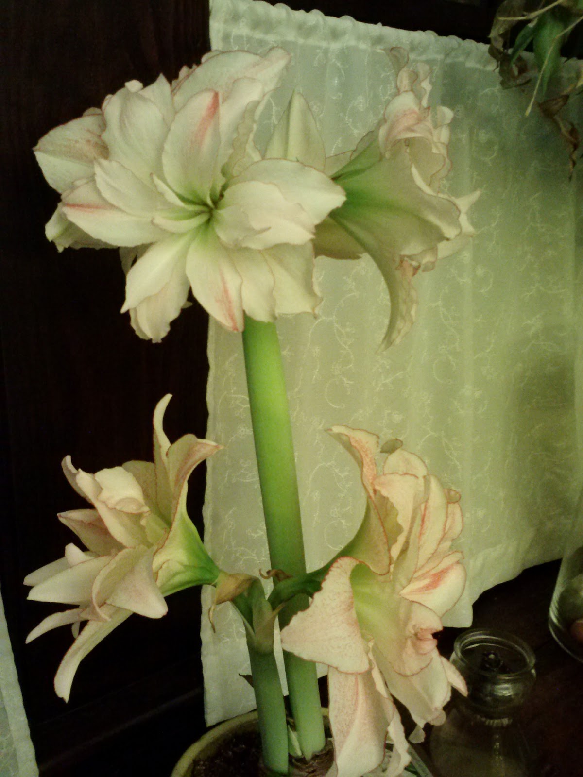 This is my Aphrodite Amaryllis that my mother gave me for Christmas. Gorgeous, right? It opened this week and it makes my day to walk in and see beautiful flowers when there is nothing but bare ground outside.